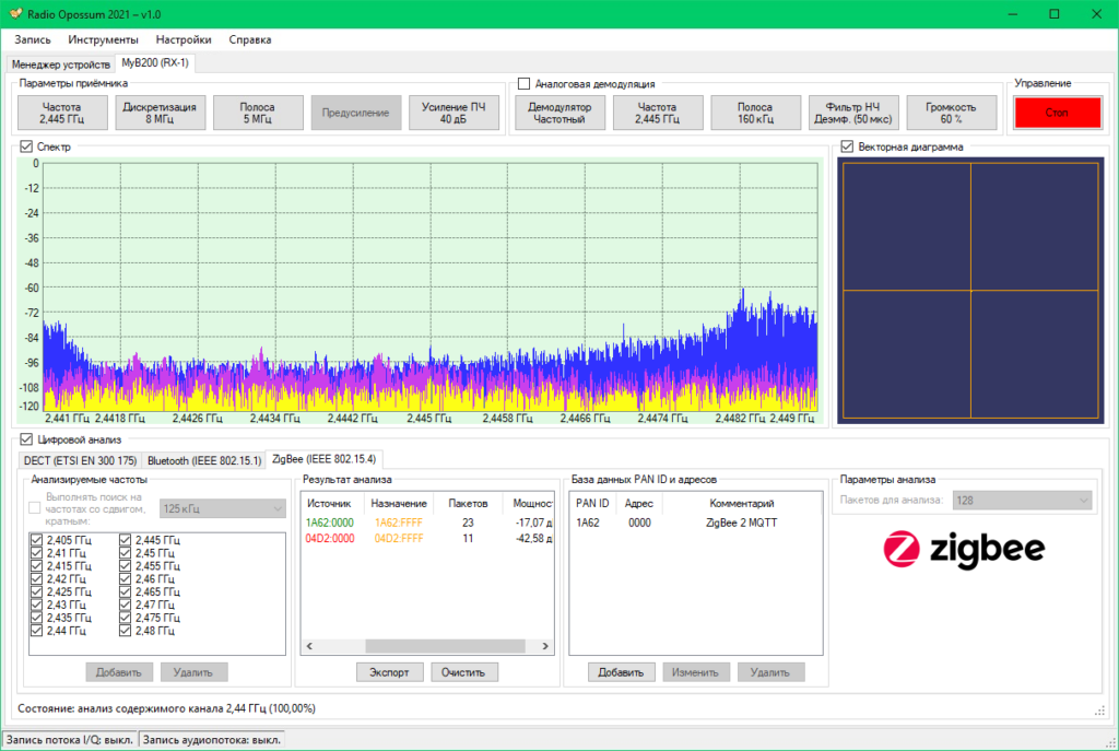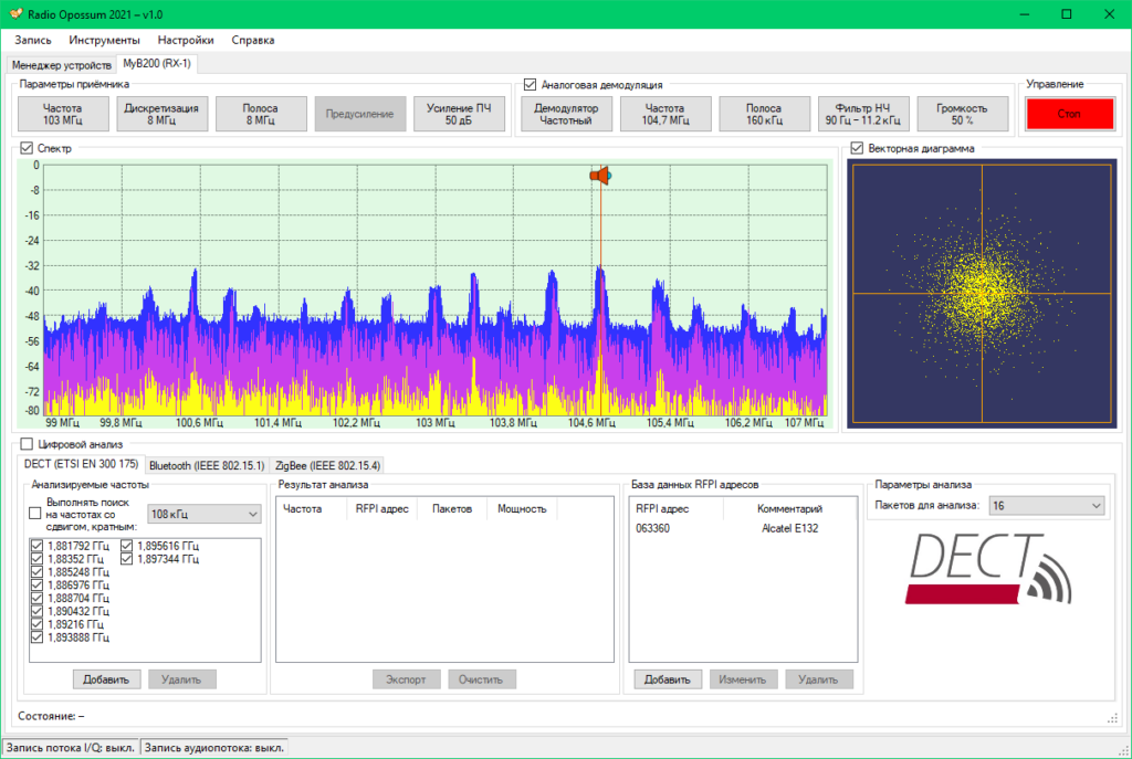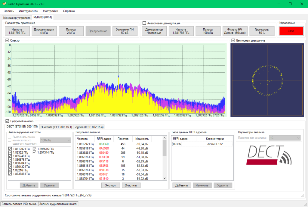 - цифровой анализ содержимого каналов стандарта микросотовой связи DECT (ETSI EN 300 175) с выводом списка RFPI адресов базовых станций и уровнями принимаемых сигналов, стандарта беспроводного доступа Bluetooth (IEEE 802.15.1) с указанием списка LAP адресов устройств и уровнями принимаемых сигналов, стандарта беспроводного доступа ZigBee (IEEE 802.15.4) с получением списка «направлений» передачи данных, каждое из которых содержит адресанта и адресата пакета данных (PAN ID + Address), а также уровень принимаемого сигнала, стандарта мобильной сотовой связи GSM с отображением иерархии базовых станций.