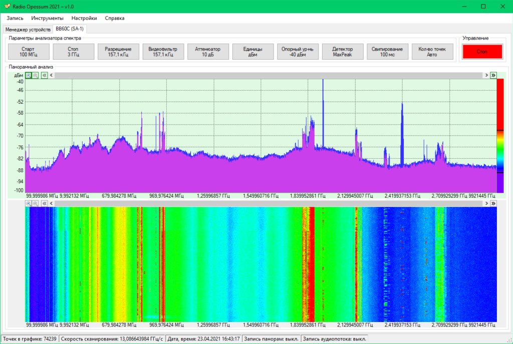 В режиме анализатора спектра (панорамного анализа, SA) программное обеспечение Radio Opossum 2021 поддерживает следующие основные функциональные возможности: