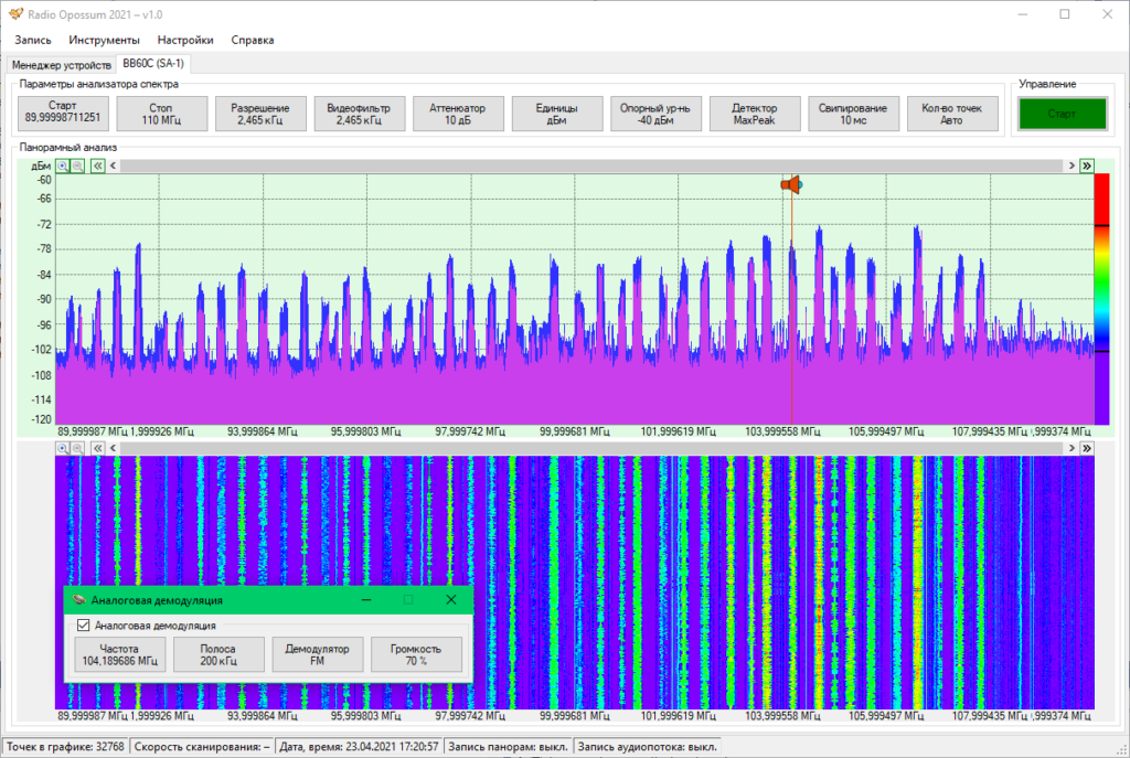 - аналоговая демодуляция радиосигналов с возможностью задания полосы пропускания, прослушиванием демодулированного аудиосигнала;